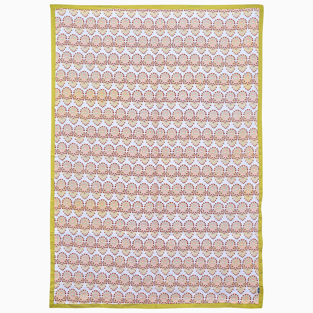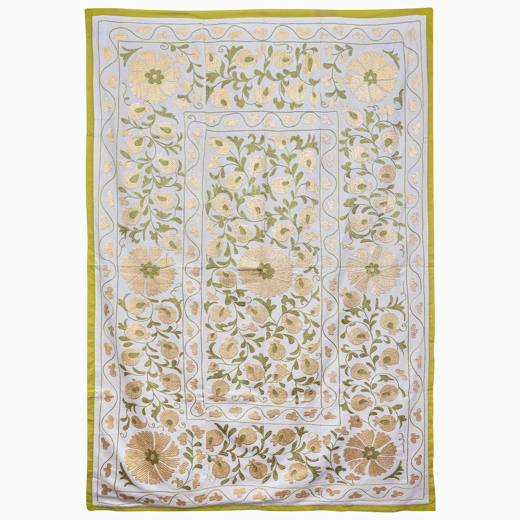 Embroidered by hand in pale gold and olive green, this suzani blanket feels like sunlight filtering through a leafy grove. Paired with John's signature Lanka fabric on the reverse.