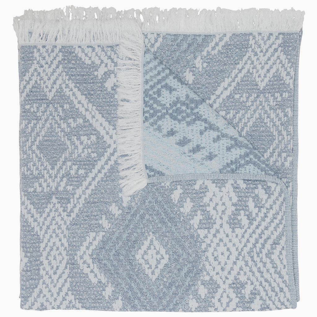 A geometric jacquard design ripples across this woven blanket in a calming shade of indigo.