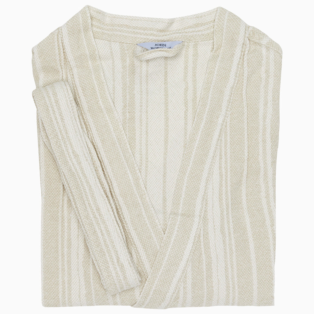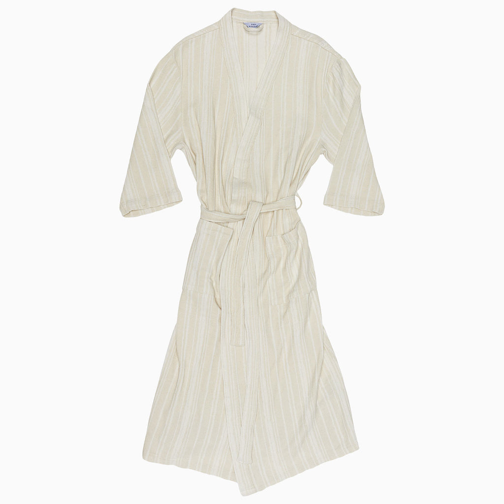 A cozy, woven robe with relaxed stripes and an easy drape.