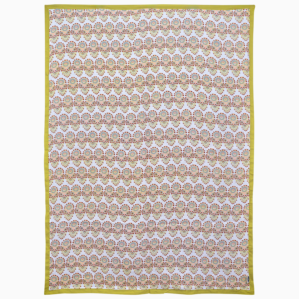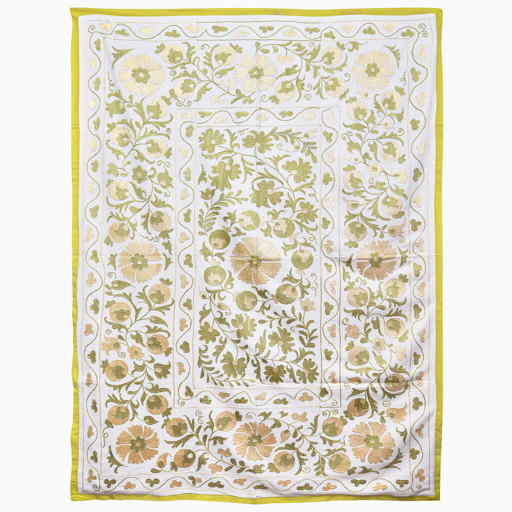 Embroidered in soft shades of moss green and golden cream, this suzani blanket evokes the freshness of a sunlit garden. The scrolling vines and blossoms are framed with a cheerful citron border. Paired with John's signature Lanka fabric on the reverse.