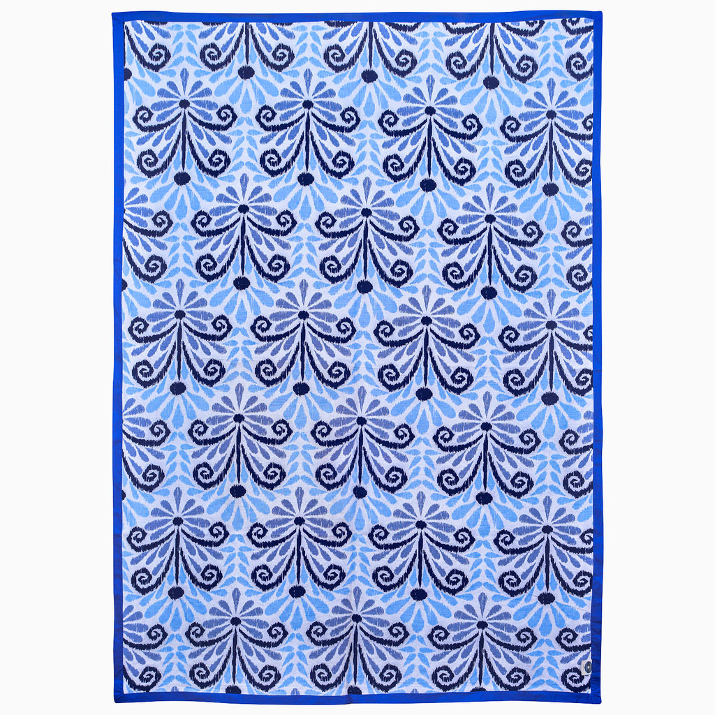 Pomegranates and curling vines bloom in vibrant shades of blue. Paired with a vibrant ikat fabric on the reverse.